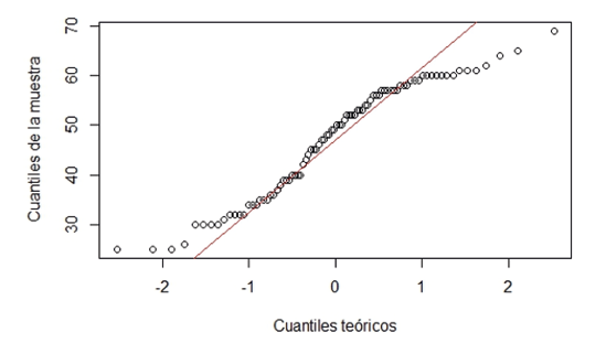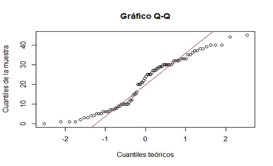 Adicionalmente, se realizó pruebas visuales, para este caso, se utilizó, el gráfico Q-Q, el cual compara los cuantiles de los datos con los cuantiles de una distribución teórica. Si los datos siguen la distribución teórica, los puntos en el gráfico Q-Q deberían aproximarse a una línea recta. El resultado se puede observar en la Figura 1.
