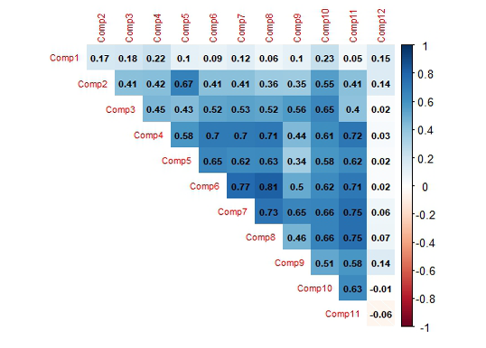 Mientras que comp1 por sí solo explica el 15 % de la varianza total, los primeros cuatro componentes siguientes, juntos, explican más del 40 %. Esta acumulación se incrementa hasta alcanzar, aproximadamente, un 82 % al incluir los primeros nueve componentes. La capacidad de estos componentes para explicar conjuntamente una proporción tan amplia de la varianza sugiere que encapsulan la mayoría de la estructura subyacente de los datos.