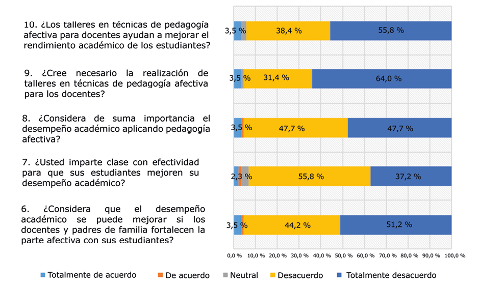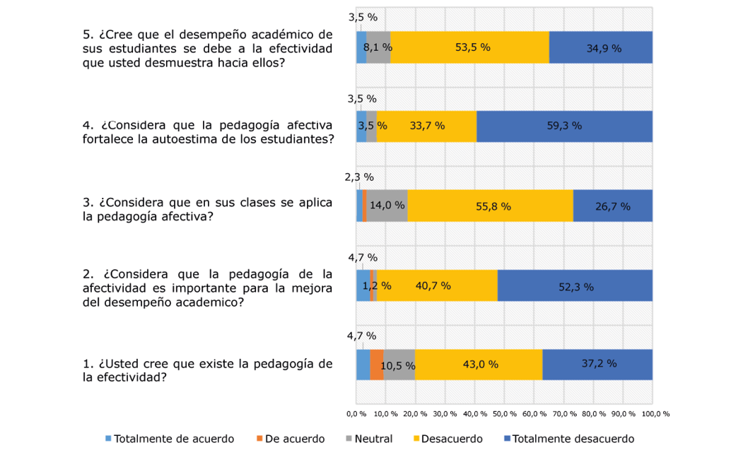 En primer lugar, al observar la respuesta a la pregunta: “¿usted cree que existe la pedagogía de la afectividad?”, se destaca una tendencia notable hacia el escepticismo, con el 43,0 % de los docentes en desacuerdo y el 37,2 % totalmente en desacuerdo. Esto puede interpretarse no solo como una falta de familiaridad con el término o concepto, sino también como un reflejo de las prioridades educativas en las instituciones estudiadas.