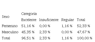 El sexo con mayor número de docentes en la categoría “Excelente” corresponde a las mujeres; las docentes tienen una participante en la categoría “regular”. Mientras que, los docentes tienen dos en la categoría “insuficiente”, es decir, las mujeres tienen mejores conocimientos y acercamiento sobre la pedagogía afectiva que los hombres.