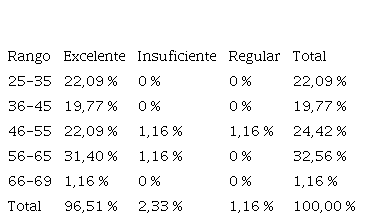 El rango de edad con mejor calificación o con categoría “Excelente” es de 56 a 65 años, con el 31,4 %, pero en el mismo rango se encontró un docente en la categoría de “insuficiente”. El rango con más números de insuficientes y regulares fue entre 46 a 55 años; sin embargo, tienen un buen porcentaje de docentes en la categoría de “Excelente”. Es decir, no hay los suficientes datos para comprobar que a mayor o menor edad signifique mejor acercamiento o conocimiento de la pedagogía afectiva.