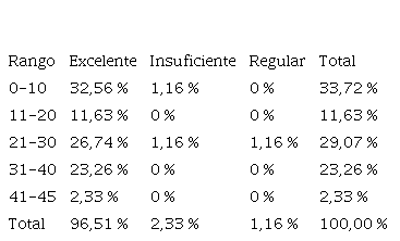 El rango de experiencia mejor calificado fue de 0 a 10 años de experiencia con el 32,56 %, aunque con un docente en la calificación de “Insuficiente”, y el de menor calificación fue el rango de 41 a 45 años, seguido de 11 a 20 años con el 2,33 % y 11,63 %, respectivamente. Sin embargo, esto no significa que a mayor rango de experiencia menor será el conocimiento de la pedagogía afectiva; solo que de la muestra encuestada hay más docentes que tienen un rango de experiencia entre 0 a 10 años. Es decir, no hay suficientes datos para comprobar que a mayor o menor años de experiencia de los docentes haya un mejor acercamiento con la pedagogía afectiva.