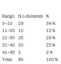 Para los rangos de experiencia docente, nuevamente se utilizó la regla de Sturges (ver Tabla 3).