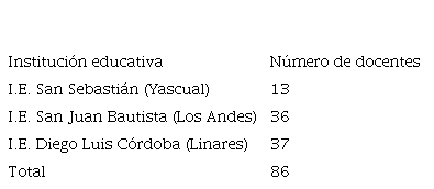 Entonces, la población correspondió a 107 docentes de las tres instituciones educativas estudiadas, a quienes se les aplicó el muestro probabilístico aleatorio, considerando una distribución normal de la población. Finalmente, se trabajó con 86 docentes, con una confianza estadística de 95 % y un error muestral de 5 %. En la Tabla 1, se puede apreciar la muestra y su distribución.