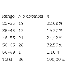 Con respecto al sexo, 41 docentes pertenecían al sexo masculino (47,7 %), y 45 docentes, al sexo femenino (52,3 %). Con respecto a la edad, el promedio estuvo comprendido entre los 47 años, aproximadamente; mientras que, el mínimo fue de 25 años y el máximo de 69 años, una desviación estándar muestral de 11,5 años. En la Tabla 2, se puede observar los rangos de edades estimados por la regla de Sturges.