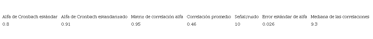 El conjunto de ítems analizados tiene una consistencia interna moderada–alta según el alfa de Cronbach clásico (0.8). Sin embargo, cuando se consideran las correlaciones estandarizadas entre ítems, la consistencia interna mejora considerablemente, con el alfa estandarizado de 0.91. La correlación promedio entre ítems es moderada (0.46). La relación señal-ruido es alta (10), lo que sugiere que la variabilidad entre los ítems es sustancialmente mayor que el error. Las fronteras de confianza del 95 % indican que el rango probable del alfa de Cronbach es entre 0.47 y 0.72 (según el método de Feldt), lo que respalda la interpretación de una consistencia interna moderada-alta.