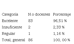 A partir de la categorización basada en las respuestas de cada ítem, se establece una escala de categorización de la influencia pedagógica afectiva de los docentes. Esta escala se define de la siguiente manera: “Excelente” comprende una puntuación de 40 a 50 puntos; “Suficiente” abarca de 30 a 39.9 puntos; “Regular” se sitúa entre 20 y 29.9 puntos, e “Insuficiente” corresponde a una puntuación de 10 a 19.9 puntos. Con base en esta metodología, se evaluó la performance de cada docente, acumulando sus respuestas para confeccionar tanto un análisis global como individual.