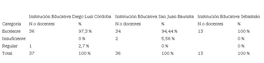 Se puede extraer que la institución educativa con mejor calificación, aunque con diferencias relativamente pequeñas, es la Institución Educativa San Sebastián, puesto que todos los docentes tuvieron una calificación de “Excelente”; seguido de la Institución Educativa Diego Luis Córdoba con el 97,3 % de los docentes categorizados con una excelente calificación; finalmente, la Institución Educativa San Juan Bautista con el 94,44 %.