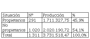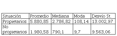 La diferencia en el promedio es notoria. A su vez, las distancias entre ese valor y mediana y moda marcan además una muy alta dispersión, medida por el desvío estándar. Además, dicha dispersión era mayor entre los no propietarios, que entre los propietarios. También se hace notar la diferencia entre el promedio de las ha que cada uno utilizaba en agricultura: los propietarios cultivaban 195 ha, mientras que los no propietarios 32.7
