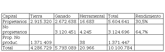 De acuerdo con el monto de capital invertido, en apariencia la rentabilidad del no propietario era mayor. Cada productor cuya parcela explotada no era de su propiedad obtenía en bruto el 64.7% del capital en juego, en ganado de todo tipo y herramental. Los propietarios, que a ese volumen de capital le agregan la tierra, obtenían un rendimiento menor en 34 puntos porcentuales, tamaña diferencia. Pero esta ecuación tiene varios otros si digo. En primer lugar, ya hemos visto que muchos titulares no ponían en juego toda su tierra en la producción; entraban en otro negocio, el arrendamiento o la especulación.