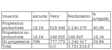 En cuanto al no propietario debe tenerse en cuenta que nuestro cálculo obvia un dato básico, que ya mencionamos, el pago de arrendamiento, medido como sea; simple alquiler, medianía tercería, etc. Tampoco tenemos en cuenta todos los gastos de mano de obra, servicio, fletes, insumos, etc. que deben abonar, en este caso todos los productores, sean o no propietarios. Es probable que la escala productiva abarate los costos, pero son datos que aún no tenemos, De modo que la diferencia entre ambos grupos -propietarios y no propietarios- la podemos fijar, grosso modo, en la renta de la tierra.