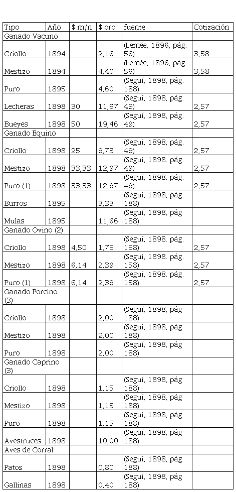 Con respecto a las aves, no se encontró precio de los avestruces; en las gallinas el publicado por La Agricultura es ligeramente más alto, pero se debe recordar que eran precios de 1896. De todos modos, en el caso de los patos hemos modificado el valor informado por Seguí, ya que la relación con el precio de la gallina no era tan abultada como se ve en el cuadro. Para la revista el precio era de m$n 2.26, equivalente a $o 0.66 puesto en Buenos Aires, valor que descontado la probable incidencia del transporte, similar al de la gallina, queda reducido a $o 0.52.