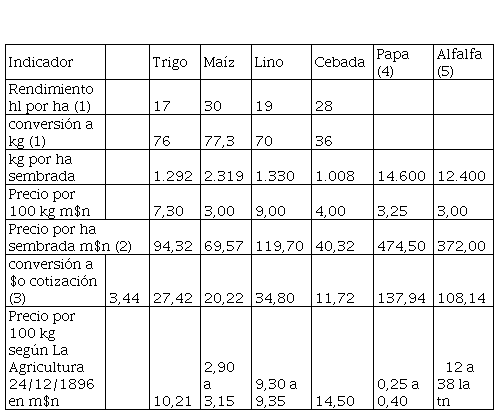 Se hizo necesario convertir la información proporcionada por las fuentes contemporáneas para calcular el precio de la ha sembrada, ya que ese es el detalle que figura en el Censo. Como se puede ver los precios así obtenidos son similares a los publicados por La Agricultura, salvo en el trigo, donde el nuestro está 30% menos y la cebada, donde la diferencia es mucho mayor: nuestro valor representa menos del 30% del informado por el periódico. De todos modos, la cebada sólo incidía en menos del 2% de la cosecha en la jurisdicción. Hemos preferido mantener la uniformidad y utilizar el precio de Seguí. Este autor especifica que la papa sólo se cultiva para consumo del productor, por lo que no consigna precio alguno. Sin embargo, la hemos valorizado con el proporcionado por La Agricultura, entre m$n 0.25 y m$n 0.40, promediados. C, Lemée proporciona precios algo superiores, pero preferí los de la publicación periódica.