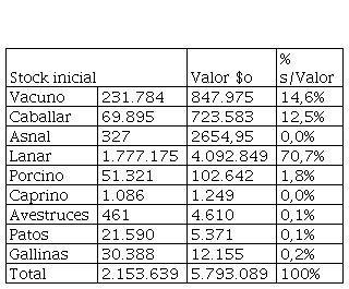El stock de ganado y aves es considerado capital, de modo que las valorizaciones de la reproducción son consideradas aumentos del capital, más allá del destino posterior de ese incremento, consumo propio o venta. De modo que tampoco tenemos en cuenta la liquidación de stock para producir bienes, como carne, tasajo, cueros, aves para consumo, carneros, chacinados, plumas, astas, sebo, etc. En definitiva, valorizo sólo aquellos productos como lana, huevos, leche, etc., que no significan liquidación de animales en stock. VBP, es decir valor bruto de producción, valorizados a precios de mercado local.
