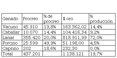 Consideramos que los bueyes no se reproducen, porque esta categoría está conformada por animales viejos ya fuera de período reproductivo. También hemos desechado el procreo de burros y mulas, infiriendo que eran reproducidos en establecimientos especiales y que no se puede reconocer si los hay en la jurisdicción, además de considerar escasa su representatividad y en muchos casos los productores tenían un solo animal.