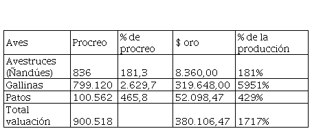 La reproducción de las aves era mucho mayor que el ganado de cuatropea, sobre todo las gallinas, cuya tasa de reproducción, calculada como se describe en el anexo metodológico, llegaba a 27 pollitos por cada ejemplar descontado el descarte de huevos. De este modo, las aves acaparaban el 25% del valor del procreo animal en su conjunto valorizado en $o. El capital sólo teniendo en cuenta el stock, se ha acrecentado en algo más de 1700%. Y esto sin tener en cuenta que las aves producen bienes que son pasibles de valorizarse sin perder su condición inicial. No se puede deducir de estos cálculos que la producción era comercializada, que generaba ingresos a los productores, ni tampoco qué porcentaje de ella era consumida en el establecimiento. También habría que tener en cuenta si la probable comercialización del animal vivo se realizaba antes de la posibilidad de reproducción. Puede deducirse que el objetivo era la producción para el mercado local y regional, tanto como animal para el consumo humano o para su producto, ya que veinte de los productores contaban con más de 100 gallinas, y algunos 400 y 500, entre ellos Julio Argentino Roca. Nada podemos deducir al respecto con esta fuente.