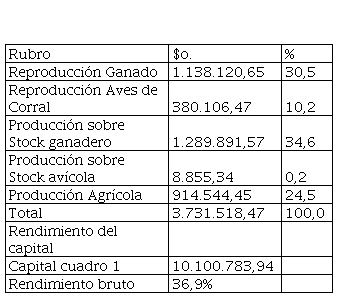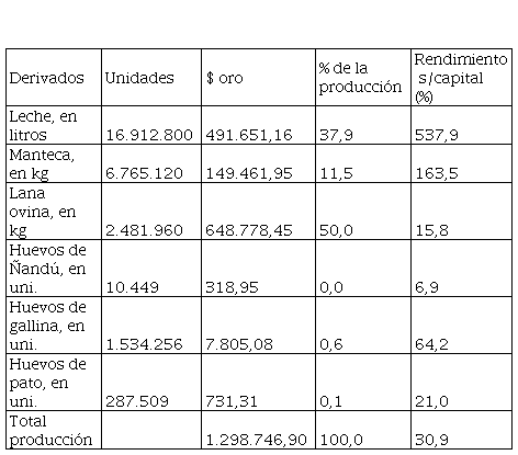 Como no hemos considerado que la reproducción de animales genere ingresos por ventas en ninguna de las especies, solo trabajamos con el aumento del capital en bruto, sin descontar en esta primera etapa los gastos necesarios para obtener esa reproducción. Pero sí tuvimos en cuenta los subproductos obtenidos de cada especie sin modificar su estatus. De modo que se ha calculado el producido de leche y manteca de las vacas lecheras, la lana extraída de los ovinos y los huevos de las aves de corral, más allá de cual fuera su destino, si el propio consumo o la venta en la jurisdicción o fuera de ella, o la exportación. De modo que nuestro cálculo es el de la producción en bruto y el del ingreso que produciría vendiéndose.