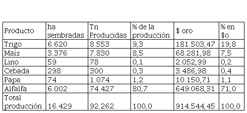 Como se puede percibir se trata de un escalón previo a la obtención del ingreso neto de los productores; estimamos que con estos datos se puede a su vez tener un esbozo de la distribución de la producción. Esta valorización se ha efectuado en pesos oro ($o), a pesar de que la moneda corriente era el peso denominado moneda nacional (m$n). De modo que los precios utilizados para el cálculo se estima que eran los que el productor obtendría vendiendo su producto en origen, sin adicionarle flete alguno, el consumo del mismo productor ni la cantidad necesaria de reserva para la reproducción., como el caso de la semilla. Este proceder es, como ya mencionamos, un primer paso hacia la construcción del ingreso, por lo que más adelante deberán descontarse los costos de producción y servicios de todo tipo para poner el producto en el lugar de la venta, así como gastos financieros.