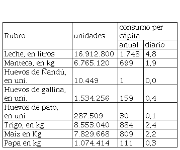 Ahora bien, el producto de la región no sólo se puede estimar a partir del acrecentamiento del stock sino también de los bienes que se pueden producir sin modificar el estatus del capital. Nos referimos a los bienes de consumo como leche, manteca y huevos, bienes que no significan el sacrificio del animal que los produce. En el siguiente cuadro se detalla esta producción (Cuadro 5).