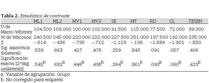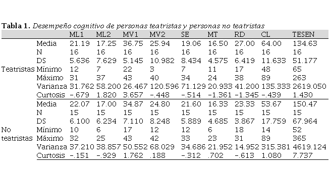 En la tabla 1 se pueden apreciar las puntuaciones medias obtenidas por los participantes del estudio, tanto de los teatristas y no teatristas, donde sus puntuaciones medias en su mayoría parecen reflejar una similitud en sus desempeños como en capacidades de memoria inmediata (ML1) de teatristas (M=21.19) y no teatristas (M=22.07), en memoria a largo plazo (ML2) también muestran puntuaciones similares entre teatristas (M=17.25) y no teatristas (M=17.00), en memoria visual inmediata (MV1) parecieran mostrar puntuaciones algo similares los teatristas (M=36.75) y no teatristas (M=34.87), así como la memoria visual demorada (MV2) de los teatristas (M=25.94) y no teatristas (M=24.80). Por otro lado, la capacidad de razonamiento abstracto verbal (SE) pareciera ser mejor de los no teatrista (M=21.60) frente a los teatristas (19.06), pero similar en razonamiento visual abstracto de los no teatristas (M=16.33) y teatristas (M=16.50). Llama la atención que los resultados parecen indicar que en velocidad de procesamiento evaluado con la prueba de Claves (CL), parece que los teatristas tienden a mostrar una puntuación más alta (M=64.00), frente a los no teatristas (M=53.67); también la capacidad de memoria de trabajo (RD), la puntuación de los teatristas (M=27.00) parece ser superior a los no teatristas; sin embargo la capacidad de atención (TESEN) pareciera que los no teatristas (M=150.47) muestran mejores puntuaciones que los teatristas (M=135.63).