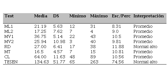 En cuanto al perfil cognitivo obtenido por los teatristas, los resultados en la mayorías de las pruebas aplicadas parecen indican que las puntuaciones reflejan un perfil cognitivo dentro del promedio, es decir dentro del desempeño que se podría considerar dentro de la normalidad, ya que éstas pruebas aplicadas su puntuación directa, es luego baremada en base a la puntuación estandarizada y en este caso algunas pruebas su puntuación estándar es una puntuación escalar, donde su media es 10 con una desviación estándar de 3, en el caso de las puntuaciones percentiles utilizan una media de 50. Como se puede apreciar en la Tabal 3, la mayoría de las puntuaciones estándar se podrían interpretar dentro del promedio y reflejando que la memoria de trabajo (RD, M=11.8) y la capacidad de atención (TESEN, M=74.56), podrían ser interpretadas como puntuaciones normales pero altas en el desempeño cognitivo de los teatristas.