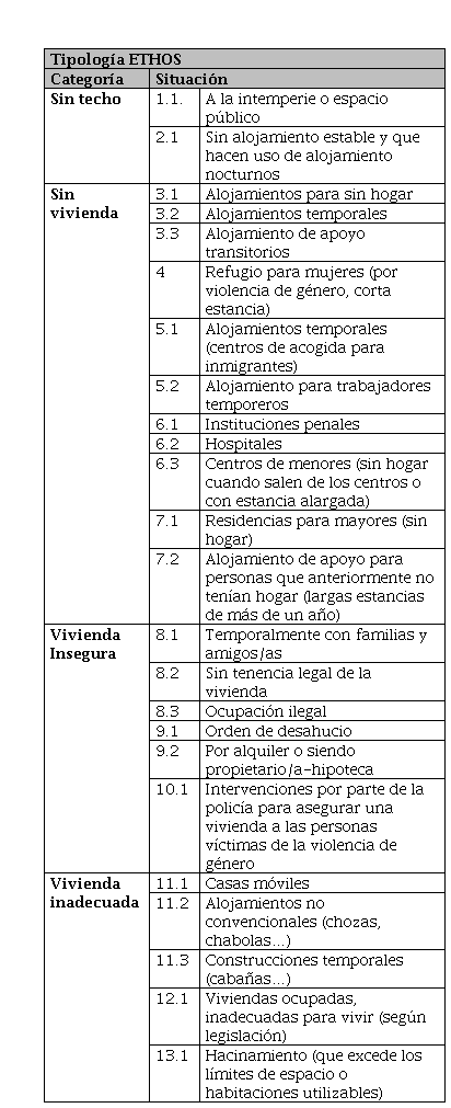 Fuente: Elaboración propia a partir de Gámez, 2018, de la tipología utilizada por el programa ETHOS por sus siglas en inglés (European Typology of Homelessness and housing exclusion).