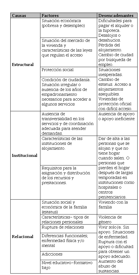 Tabla 2. Relación entre las causas, factores de influencia y desencadenantes del sinhogarismo.