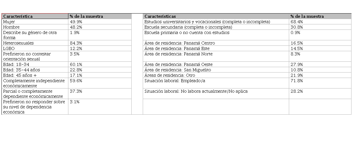 De las 351 personas que respondieron la encuesta, 49.9% son mujeres, 48.2% hombres, y 1.9% describieron su género de otra forma o prefirieron no responder (ver Tabla 1). 84.3% se identifican como heterosexuales, 12.2% como lesbianas, gais, bisexuales o describen su orientación sexual de otra forma (LGBO) y 3.5% prefirieron no contestar. La proporción de personas desempleadas y con estudios universitarios es superior a la que se reporta a nivel nacional. 60.1% tienen entre 18 y 34 años, 22.8% entre 35 y 44 años y 17.1% tienen 45 o más años de edad. Aunque esta muestra no es representativa en términos de edad, por lo que no podríamos extrapolar los resultados a todas las personas que viven en el área metropolitana de la Ciudad de Panamá, sí nos permite explorar las experiencias de personas más jóvenes con relación a otros grupos de edades. Esto parte de la suposición de que este grupo tendría más experiencias recientes de este tipo de comportamientos. Finalmente, 59.5% reportaron ser completamente independientes económicamente, 37.3% dependen parcial o completamente de otras personas y 3.2% prefirieron no contestar.