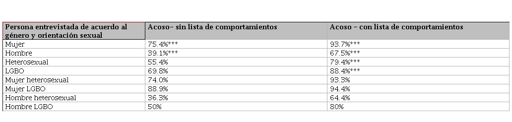 Ambas tablas muestran claramente que proporcionar una lista de comportamientos considerados como acoso sexual callejero aumenta significativamente el reporte de estos incidentes. Esto sugiere que muchas personas no reconocen ciertos comportamientos como acoso hasta que se les explicita. En todas las categorías estudiadas, el porcentaje de personas que reportaron acoso aumentó cuando se les proporcionó la lista de comportamientos.