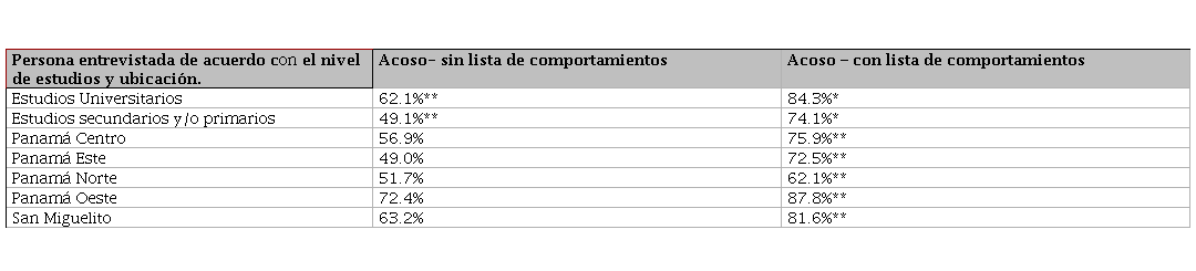 El área de residencia también revela diferencias significativas con la enumeración de la lista de comportamientos. Por ejemplo, en Panamá Centro, el 56.9% reporta acoso sin la lista, aumentando al 75.9% con la lista, una diferencia significativa al 95%. Igualmente, en San Miguelito, el 63.2% reporta acoso sin la lista y el 81.6% con la lista.