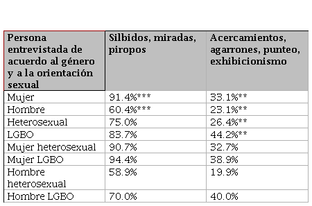 En cuanto al segundo tipo de comportamientos ("acercamientos, agarrones, punteo y exhibicionismo"), el 33.1% de las mujeres reportan haberlos sufrido, en comparación con el 23.1% de los hombres. Esta diferencia es menos marcada que en el primer grupo, pero aún significativa. Las personas LGBO reportan una mayor incidencia (44.2%) que las heterosexuales (26.4%), con diferencias estadísticamente significativas al 95%. Las mujeres LGBO reportan una incidencia del 38.9%, ligeramente superior al 32.7% de las mujeres heterosexuales, pero estas diferencias no son estadísticamente significativas. Entre los hombres, los heterosexuales reportan una incidencia de 19.9% y los hombres LGBO de un 40.0%. Estos resultados destacan que el acoso sexual callejero afecta mayoritariamente a las mujeres. Sin embargo, las personas LGBO reportan una tasa más alta de experiencias de acercamientos, agarrones, punteos y exhibicionismo que las mujeres (33.1% v 44.2%).
