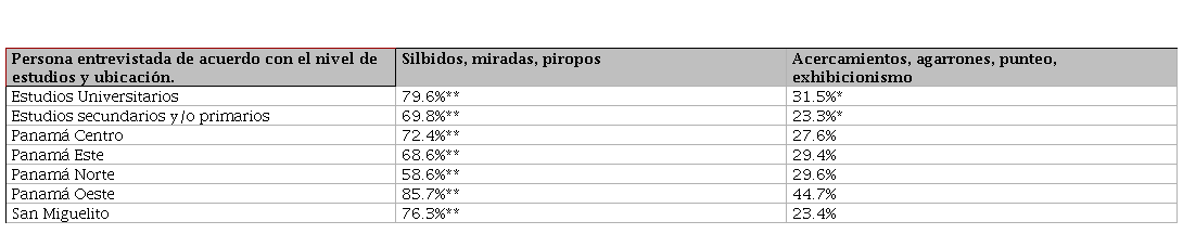En cuanto a la residencia, en San Miguelito, el 76.3% reporta haber sufrido "silbidos, miradas y piropos" y Panamá Oeste muestra el porcentaje más alto, con un 85.7%. Para "acercamientos, agarrones, punteo y exhibicionismo", las diferencias entre áreas de residencia no son estadísticamente significativas. Igualmente, se intentó perfilar estos tipos de acoso por edad e independencia económica, pero los resultados no fueron estadísticamente significativos.