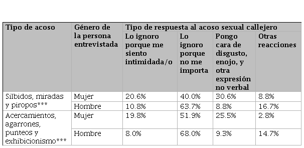 La tabla 7 revela las diferentes respuestas de hombres y mujeres a las dos grandes categorías de tipos de acoso sexual callejero que hemos agrupado en este estudio, ambas con diferencias estadísticamente significativas al 99%. En el caso de "silbidos, miradas y piropos", el 20.6% de las mujeres indicó que ignoran el acoso porque se sienten intimidadas, mientras que el 40.0% lo ignora porque no les importa. Un 30.6% de las mujeres pone cara de disgusto, enojo u otra expresión no verbal, y un 8.8% manifiesta otras reacciones. Los hombres, por otro lado, ignoran el acoso en un 10.8% debido a intimidación y en un 63.7% porque no les importa. Solo el 8.8% de los hombres responde con una expresión no verbal de disgusto. Para "acercamientos, agarrones, punteos y exhibicionismo", el 19.8% de las mujeres ignora el acoso por sentirse intimidadas y el 51.9% porque no les importa. Un 25.5% muestra una expresión no verbal de disgusto y un 2.8% tiene otras reacciones. En contraste, el 8.0% de los hombres ignora el acoso por intimidación y el 68.0% porque no les importa. Solo el 9.3% de los hombres muestra disgusto. La encuesta también refleja que de las personas que experimentaron "acercamientos, agarrones, punteos y exhibicionismo", solo dos personas (ambas mujeres) presentaron una denuncia. En la categoría de "silbidos, miradas y piropos", tres personas presentaron denuncias, incluyendo dos mujeres y un hombre. Estos datos sugieren una baja tendencia a denunciar el acoso sexual callejero, destacando la normalización de esta forma de violencia, desconfianza en el sistema o una falta de recursos para abordar adecuadamente estos incidentes en las respuestas de las personas entrevistadas.