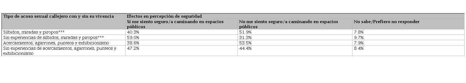 Para las personas que han experimentado "silbidos, miradas y piropos”, el 40.3% se siente segura caminando en espacios públicos, mientras que el 51.9% no se siente segura. En contraste, aquellos sin experiencias de este tipo de acoso muestran una percepción de seguridad significativamente mayor: el 59.0% se siente seguro, el 31.3% no se siente seguro y el 9.7% prefirió no responder. Estas diferencias son estadísticamente significativas al 99%.