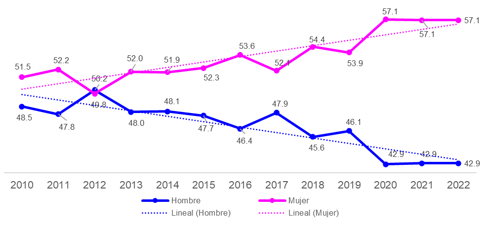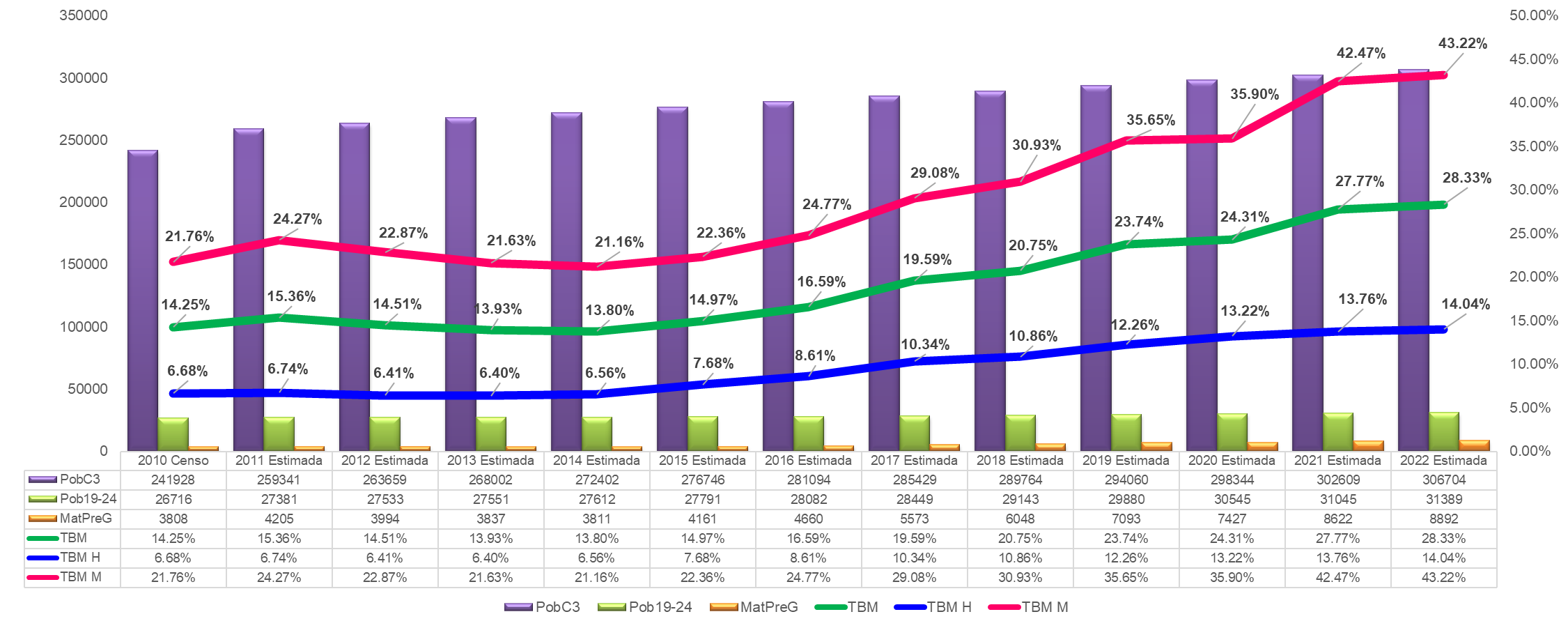 Hubo tendencia creciente en el indicador a partir del 2014, terminando en el 2022 con una TBM total de 28.33% (hombres 14.04%, mujeres 43.22%).