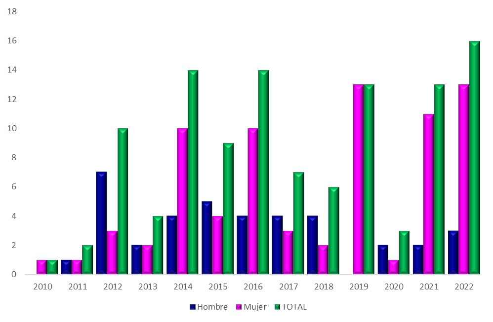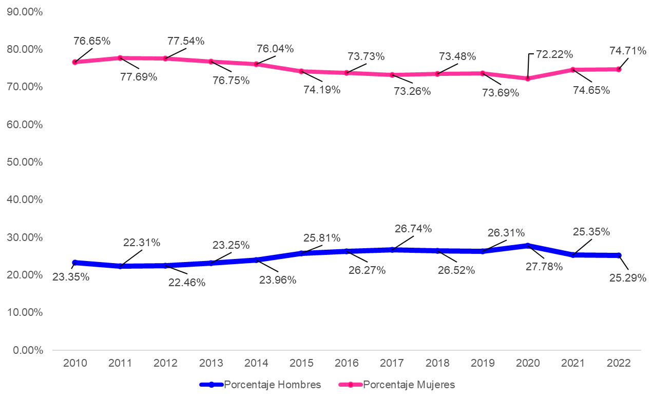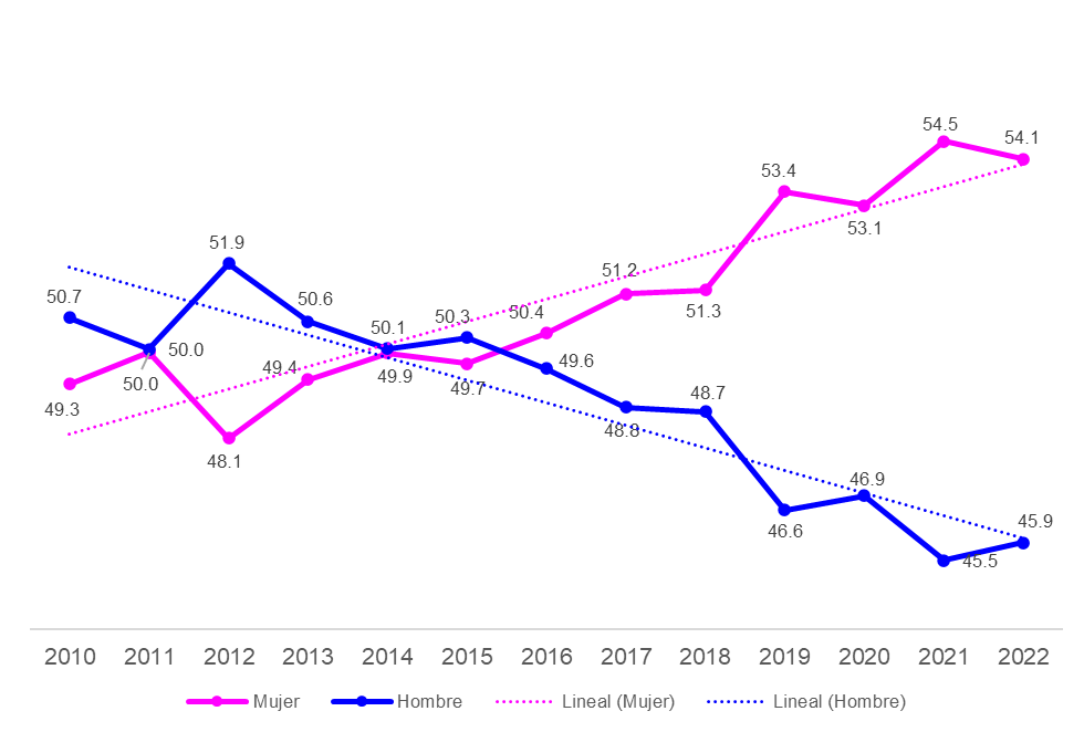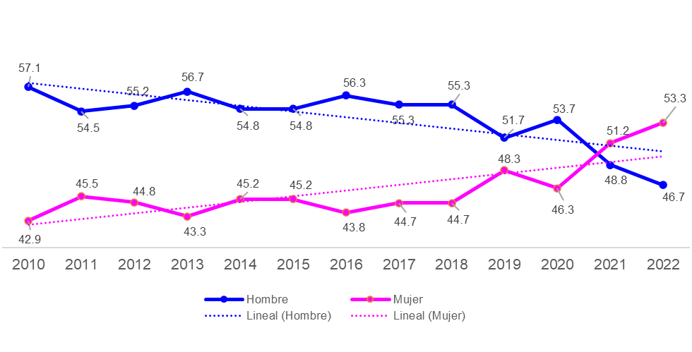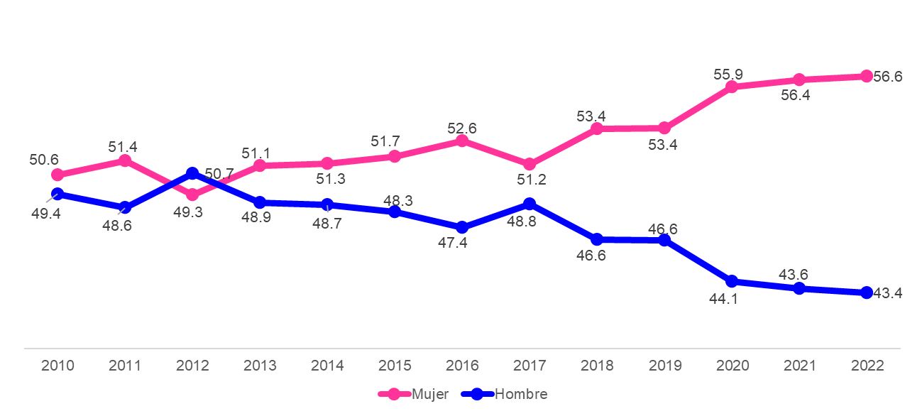 De manera muy similar a la totalidad de los docentes del CRU de Colón, los hombres solo resultaron ser mayoría en la dedicación a Tiempo Parcial y Tiempo Medio en el año 2012 cuando representaron el 50.2%. Durante los otros doce años representaron entre el 48.5% en el 2010 y 42.9% en el 2022, manteniendo la tendencia a la baja durante todo el periodo con excepción del año 2012. Por su parte las mujeres, con excepción del año 2012 cuando se cifraron en 49.8%, mantuvieron la tendencia al alza al pasar de 51.5% en el año 2012 al 57.1% en el 2022.