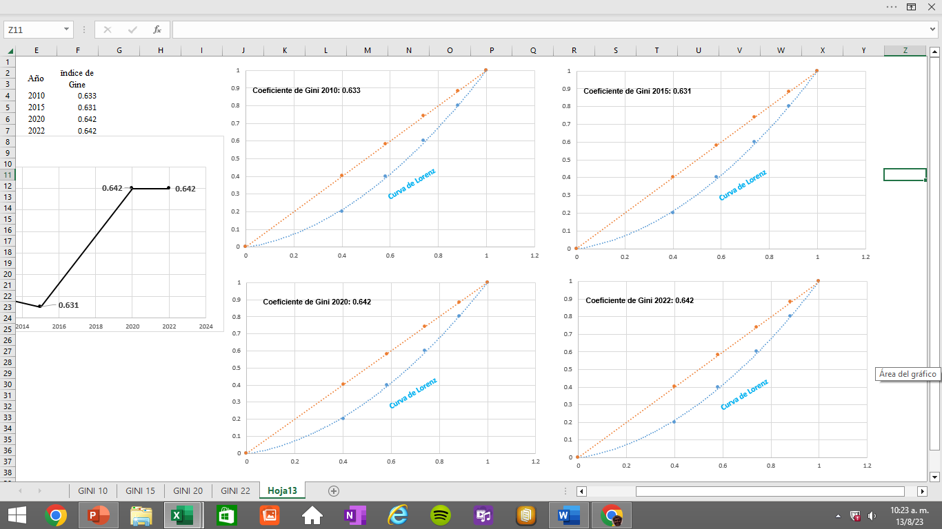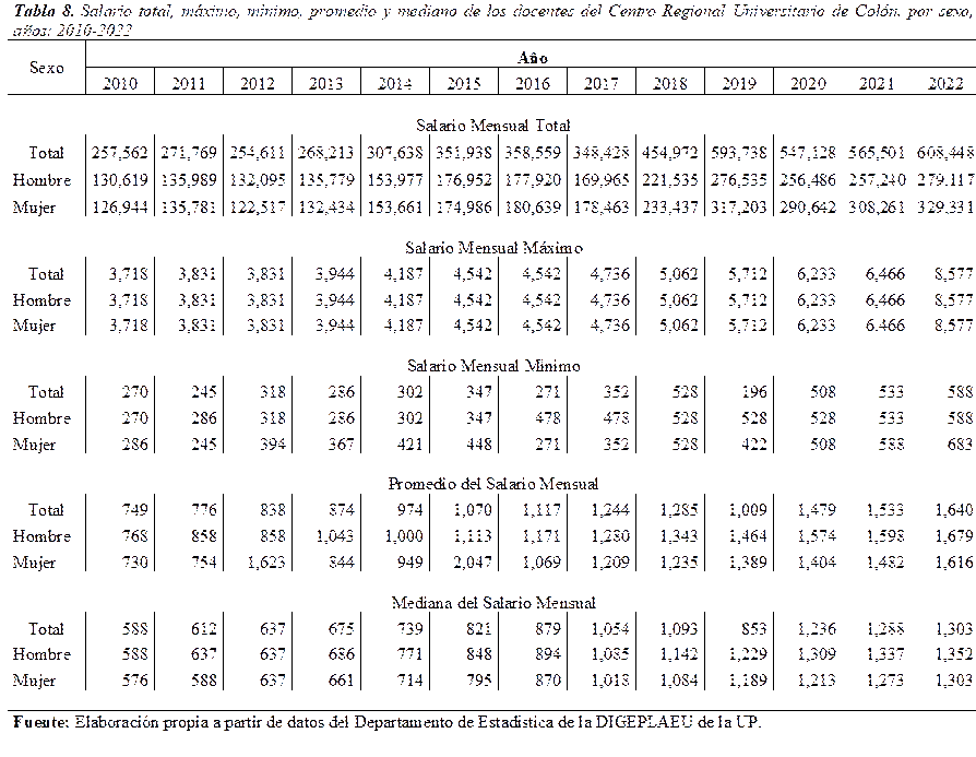 El Índice de Gini que normalmente se utiliza para medir la desigualdad de los ingresos, el cual asume valores entre 0 y 1, donde 0 representa la perfecta igualdad (todos tienen el mismo ingreso) y 1, la perfecta desigualdad (una persona tiene todos los ingresos y los demás, ninguno). El índice de Gini también puede ser expresado en referencia a 100 como máximo, en vez de 1. En el caso que nos ocupa, el índice de Gini, aplicado a los salarios que perciben los docentes en el Centro Regional Universitario, calculado para los años 2010, 2015, 2020 y 2022, manifestó los siguientes valores: 0.633, 0.631, 0.642 y 0.642 respectivamente. Esto expresa una mala distribución de los salarios por encima de la mediana, cuyas causa pueden encontrarse en función de las distintas categorías de docentes (Asistente, Profesor Especial, Profesor Adjunto, Profesor Regular) y la dedicación (Tiempo Completo, Tiempo Medio, Tiempo Parcial).