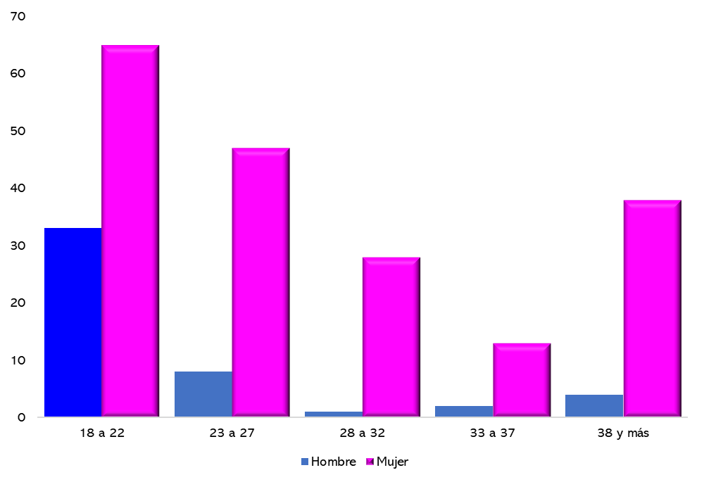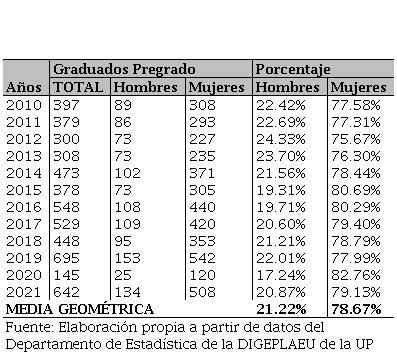 Es de esperar que, con un mayor peso de las mujeres en la matrícula, el número de graduados siga el mismo comportamiento. El índice hombre / mujer ó índice de masculinidad indicó que por cada 100 mujeres graduadas habría solamente 27 hombres que lograron completar sus estudios universitarios durante el período de análisis.