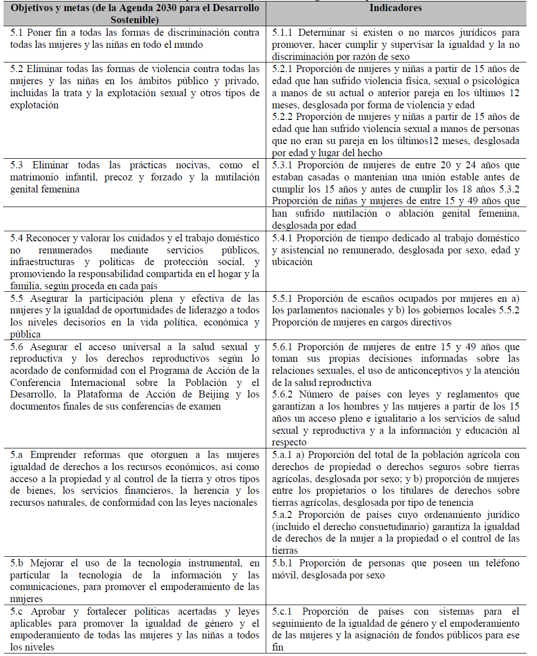 Al respecto de la medición del cumplimiento de los ODS la ONU propuso un Marco de indicadores mundiales para los ODS y metas de la Agenda 2030 para el Desarrollo Sostenible que orientaran su monitoreo y medición de, entre éstos el ODS5.