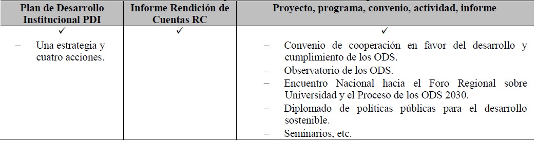 - Se logra identificar un esfuerzo inicial de la institución para cumplir con los compromisos de los ODS. Se ubica 1 estrategia y 4 acciones en el PDI vigente. Existen algunas menciones en informes, proyectos, programas, convenios, actividades, no obstante, no se logró ubicar información explícita con respecto al cumplimiento y avance de los ODS, es especial el ODS5.