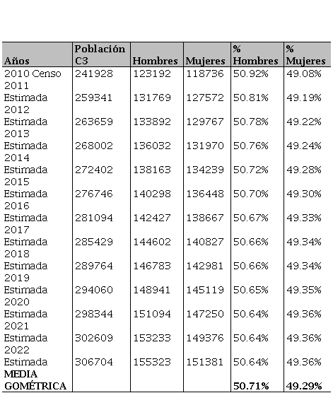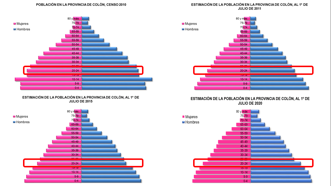 A nivel provincial, la paridad poblacional por sexo parece ser casi igualitaria. Al analizar las pirámides poblacionales, esta vez agregando los grupos etarios, se observan cambios paulatinos haciéndose la base de la pirámide más angosta lo que estaría sugiriendo una progresividad. No se perciben dramáticos cambios de género en la población. No obstante, los datos censales de 2010 muestran mayor número de hombres que mujeres a partir de los 70 años. Las estimaciones al 2015 muestran esta característica a partir de los 65 años y con las estimaciones de 2020 a partir de los 55 años.