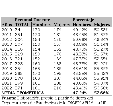 El número de personal docente mostró diferencias de género (en promedio) de hasta 6 puntos porcentuales de las mujeres sobre los hombres.
