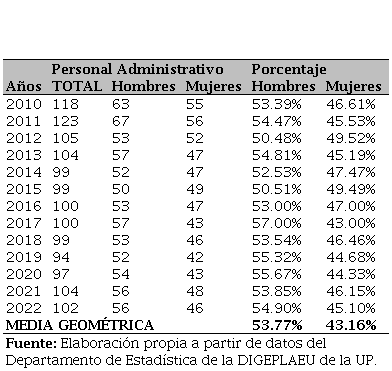 En cuanto al personal administrativo hubo diferencias de género (en promedio) de hasta 10 puntos porcentuales de los hombres por encima de las mujeres.