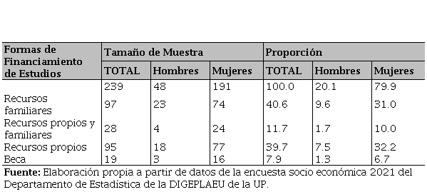 Una muestra mayoritariamente de mujeres reveló que el financiamiento de los estudios está mayoritariamente entre recursos familiares y recursos propios - familiares, comportamiento similar tanto para hombres como para mujeres.