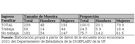 A partir de la última encuesta socio – económica que aplicara el Departamento de Estadística de la DIGEPLAEU (2021) se intenta realizar un proceso de inferencia para valorar la variable ingresos en la población estudiantil. La encuesta se trabajó con un nivel de confianza del 98% para un cálculo del tamaño de muestra para estimar proporciones ajustado a un muestreo aleatorio estratificado (tomando como estrato el tamaño de cada sede - incluyendo los programas anexos - n=239). En su segunda fase se trabajó la selección de la muestra por conglomerados (grupos), los cuales fueron escogidos de acuerdo a su tamaño hasta completar el tamaño de muestra calculado.