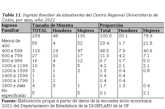 Los ingresos familiares en la muestra estuvieron concentrados en los intervalos 599 balboas y un mínimo porcentaje reportó ingresos mayores a 1000 balboas.