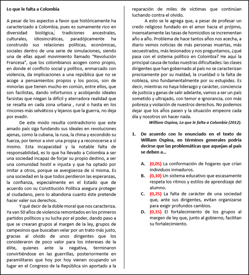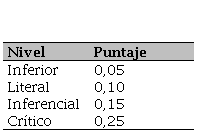 Referente a la aplicación del diagnóstico inicial para identificar el grado de comprensión lectora del estudiante en sus niveles inferior, literal, inferencial y crítico, se empleó una adaptación de la batería de evaluación de los procesos lectores en secundaria y bachillerato -PROLEC-SE-R- (Cuetos, Arribas y Ramos, 2016), que de acuerdo con los aspectos técnicos de la prueba, se establecieron puntajes para cada nivel de lectura (Tabla 3), cuya muestra del modelo aplicado con sus respectivas valoraciones cuantitativas (Figura 1), constó de 20 preguntas con cuatro opciones de respuesta en cada una: