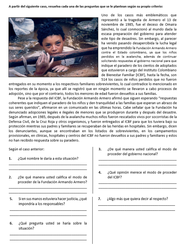 Aunque lo consignado en las respuestas no se adscribe suficientemente a las habilidades establecidas por los precursores del critical thinking movement (Ennis, 2011; Epstein, 2006; Facione, 2007; Gelder, 2005; Kuhn y Weinstock, 2002; McPeck, 2017; Paul y Elder, 2005), y que técnicamente han venido siendo corroboradas por distintos estudios sobre el tema (Atencia y Reales, 2023; Calderón y Berrío, 2021; Castillo, 2022; Hoyos y Lizarazo, 2020; Hoyos, Ruiz y Toro, 2018; Júdex, Borjas y Torres, 2019; Ortiz, 2016; Steffens, Ojeda, Martínez, et al., 2017), en cuanto a la primera pregunta, la mayoría de estudiantes consideraron la situación de “descarada”, “irresponsable”, “rabia”; en la segunda de “berraca”, “luchadora”, “arriesgada”, “infructuosa”; en la tercera registraron “ladrones”, “indiferente”, “corruptos”; en la cuarta, “corruptos”, “chanchulleros”; en la quinta, “les haría lo mismo pa’que aprendan lo que es bueno”, “los metería a la cárcel de por vida”, “buscaría a los niños por todo el mundo para devolvérselos a las mamás”; en la sexta, “¿por qué la gente es tan mala?”, “¿por qué en vez de proteger los niños se los regalaron a otras personas?”, “¿por qué hicieron eso?”; en la séptima, “ojalá el problema se solucione rápido”, “nada”.
