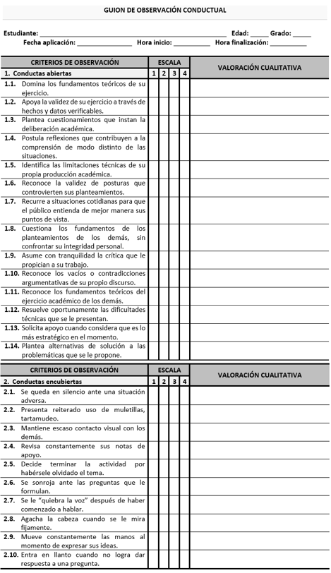 Respecto al guion de observación conductual implementado (Figura 3), este se aplicó en dos situaciones distintas; la primera correspondió a un foro de discusión en el aula de clase, la segunda a una actividad de salida de campo a un lugar emblemático del sector donde se encuentra ubicada la Sede Principal de la IER Valentina Figueroa Rueda. Y aunque lo observado en el primer caso develó que a excepción de tres estudiantes del grado séptimo, cuatro de octavo, cuatro de noveno, tres de décimo y dos de undécimo, se distinguieron por un desempeño alto en los criterios 1.2, 1.4, 1.7, 1.8, 1.13, 2.8, 2.9, mientras que el resto se ubicaron en básico con tendencia a bajo en lo relacionado con las conductas encubiertas; en el segundo, teniendo en cuenta que no se presentaron mayores cambios, dado que a pesar de ser un ejercicio sin mayor presión que la ocasionada por estar frente a un público (Ander-Egg y Aguilar, 2002; Bados, 2005; Barrio, Ruiz y Borragán, 2006; Becerra, 2017), los criterios 1.9, 1.10, 1.12, 1.13, 1.14, 2.1, 2.2, 2.8, 2.9, fueron los de más bajo desempeño.