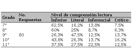 Por lo que en concordancia con los resultados obtenidos en la aplicación de la misma (Tabla 4), se evidencia que del total de respuestas seleccionadas por los estudiantes, el grado noveno se destacó por el porcentaje más bajo de respuestas correspondientes al nivel inferior de lectura (26,3%), mientras que séptimo y octavo se destacaron por la mayor cantidad en el mismo nivel con un 62,5% y 60% respectivamente, seguidos por décimo y undécimo, considerando que este último le corresponderá presentar las pruebas Saber 11 en el presente año, test estandarizado que medirá una vez más la capacidad lectora del estudiante, ya que según su desempeño en el área de ciencias sociales, se contribuirá a la clasificación del plantel en el ranking nacional de instituciones educativas.